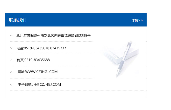 地址:常州市新北區友邦商務大廈1幢16、17層  電話:0519-85101652  傳真:0519-85112595  郵編:213022  網址:www_cz-jiayue_cn.ruiguojx.com  郵箱:xiajifengaa@163.com